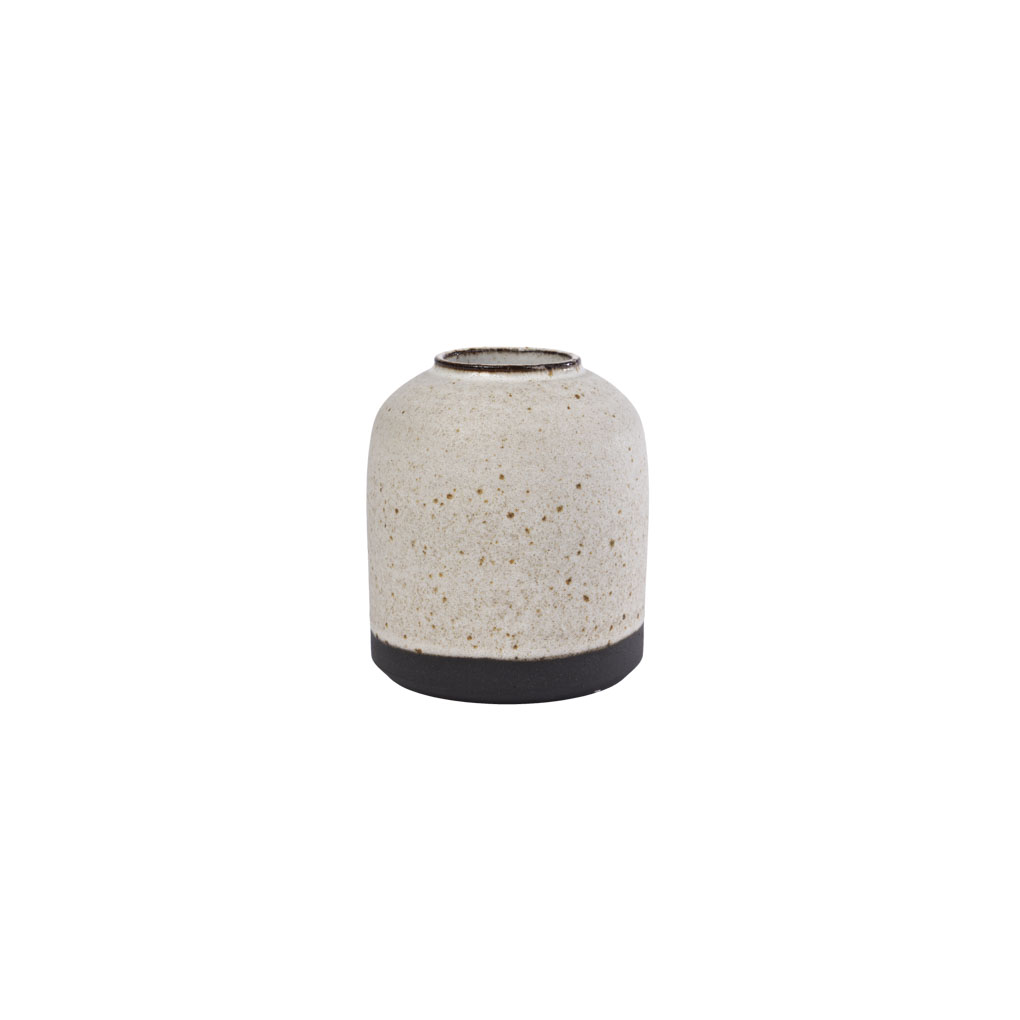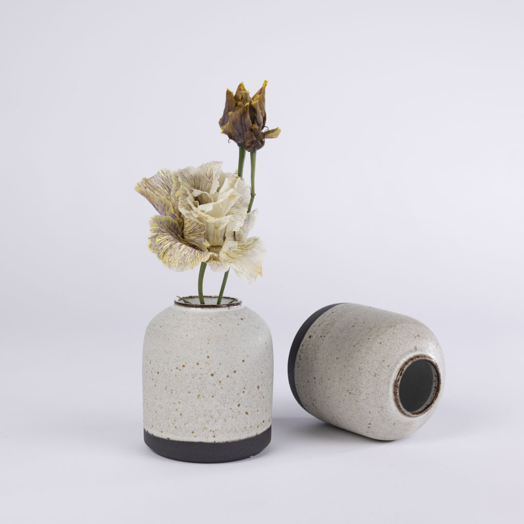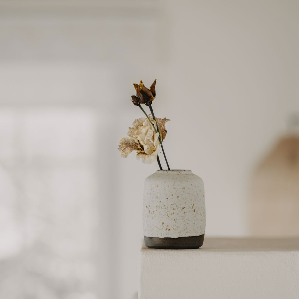 Diese kleine Vase ist ein echtes Schmuckstück für dein Zuhause. Gefertigt aus dunkelgrauem Ton mit kleinen Sprenkeln, die durch die matte, weiße Glasur sanft hindurchschimmern, vereint sie schlichte Eleganz mit natürlicher Schönheit. Mit ihrem Durchmesser von 8 cm und einer Höhe von 10,5 cm eignet sie sich perfekt für einzelne Blumen, kleine Sträuße oder als dekoratives Element in deinem Wohnraum. Besonders schön wirkt die Vase mit frischen Blumen aus unserem Slowflower Bouquet. Gemeinsam bringen sie natürliche Schönheit und eine besondere Atmosphäre in dein Zuhause – nachhaltig und stilvoll zugleich.