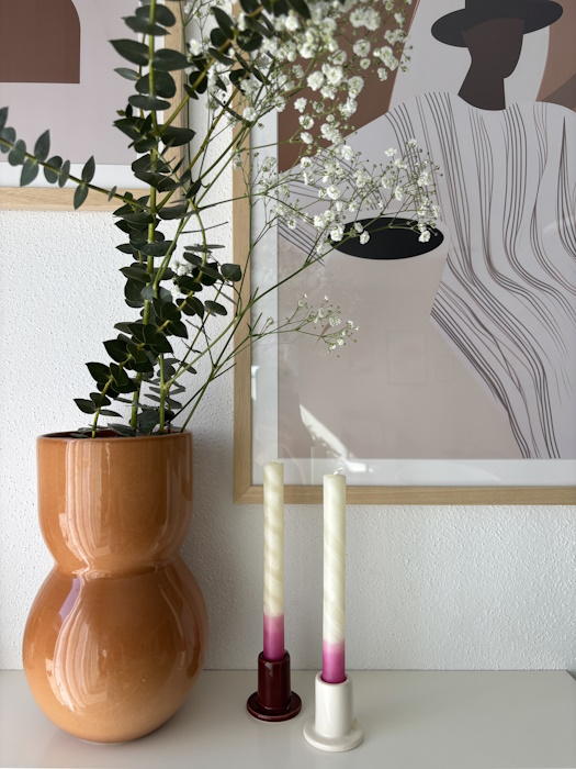 Schlichte Kerzenhalter aus Glas, Keramik oder Metall lassen den Farbverlauf wirken. Eine feine Vase mit einem einzelnen Zweig, ein paar Gräsern oder etwas Schleierkraut ergänzt den Look – dezent, zeitlos und zu jeder Saison passend.